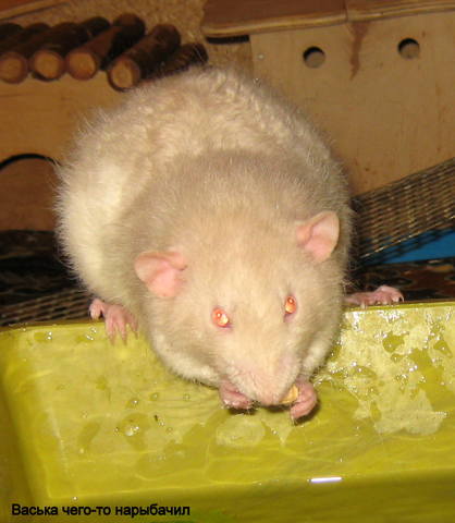 У нас жара, причём в доме. Наверху 30, внизу 28. Крысам сначала был выдан бассейн, потом их эвакуировали вниз и каждые полчаса принудительно купали. Бассейну мужики обрадовались, младшие плескались, как утки. Вот насильное купание они не одобрили, но против лома... Кое что удалось заснять. К сожалению, не успела щёлкнуть, как Васька нырял за огурцом.