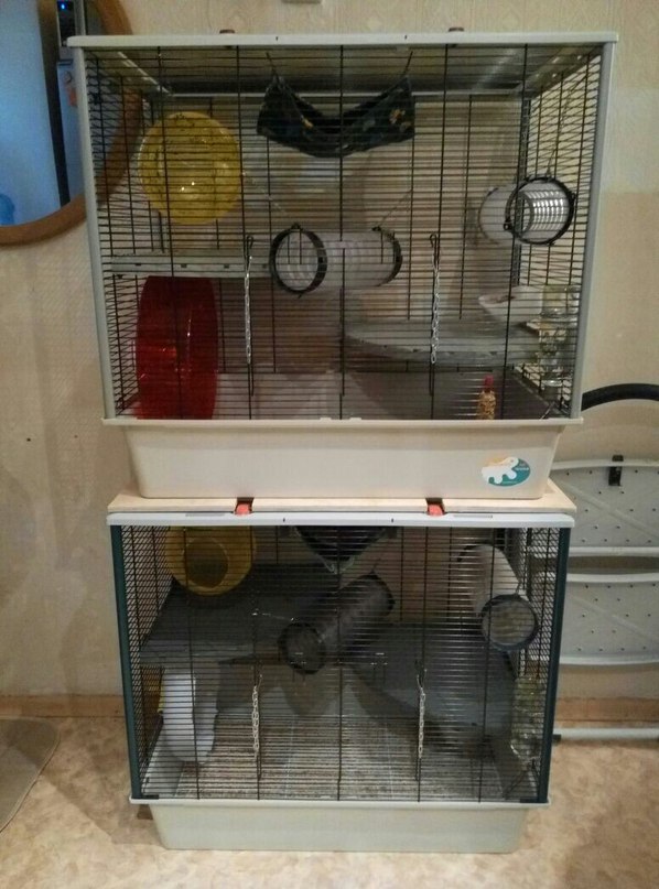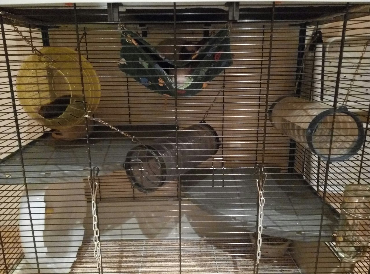 Есть там гамаки, по одному на клетку. Не люблю много навешивать, да и крысы все равно кучкуются в одном.